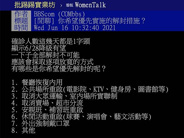 餐飲業 旅行團 健身房 電影院 疫情 中央流行疫情指揮中心 新冠肺炎 解封 三級警戒 禁止內用 微解封 有條件解封 7/13 7/12 風傳媒歡迎各界分享發聲. 降半旗 月底第三級防疫會降為第二級 大部分的封閉狀況也會解封 民進黨政府和陳時中 一定會大吹大擂自己的功勞 綠色名嘴和網軍 一定會群起歌功頌德 不但打死不承認 3+11和諾福特的錯誤 還會無視柯文哲和侯友宜 兩人在5月14日率先發難廣篩的首功 更會加大力氣攻擊兩人的「失誤」 觀諸各國的經驗. 頂多是降級,不是解封。 ……如同阿中部長 14 日記者會上說的,一旦有社區感染和社區傳播後,事實上要完全 0 可能性已經非常低了。 然後有政治人物說三級警戒和二級警戒之間,應該要有 2.5 級的警戒? 那為什麼不是 2.6、2.7 或 2.8 級? 再細分 2.64、2.51 之類的豈不更微妙更有操作空間? 有沒有微解封和 2.5 級警戒這些新概念的八卦?國外有微解封的說法嗎? 陳時中喊726解封「可能性很高」 醫預言降回二級場景 編輯 周嘉茹 報導 發佈時間:2021/07/18 10:54 最後更新時間:2021/07/18 10:54